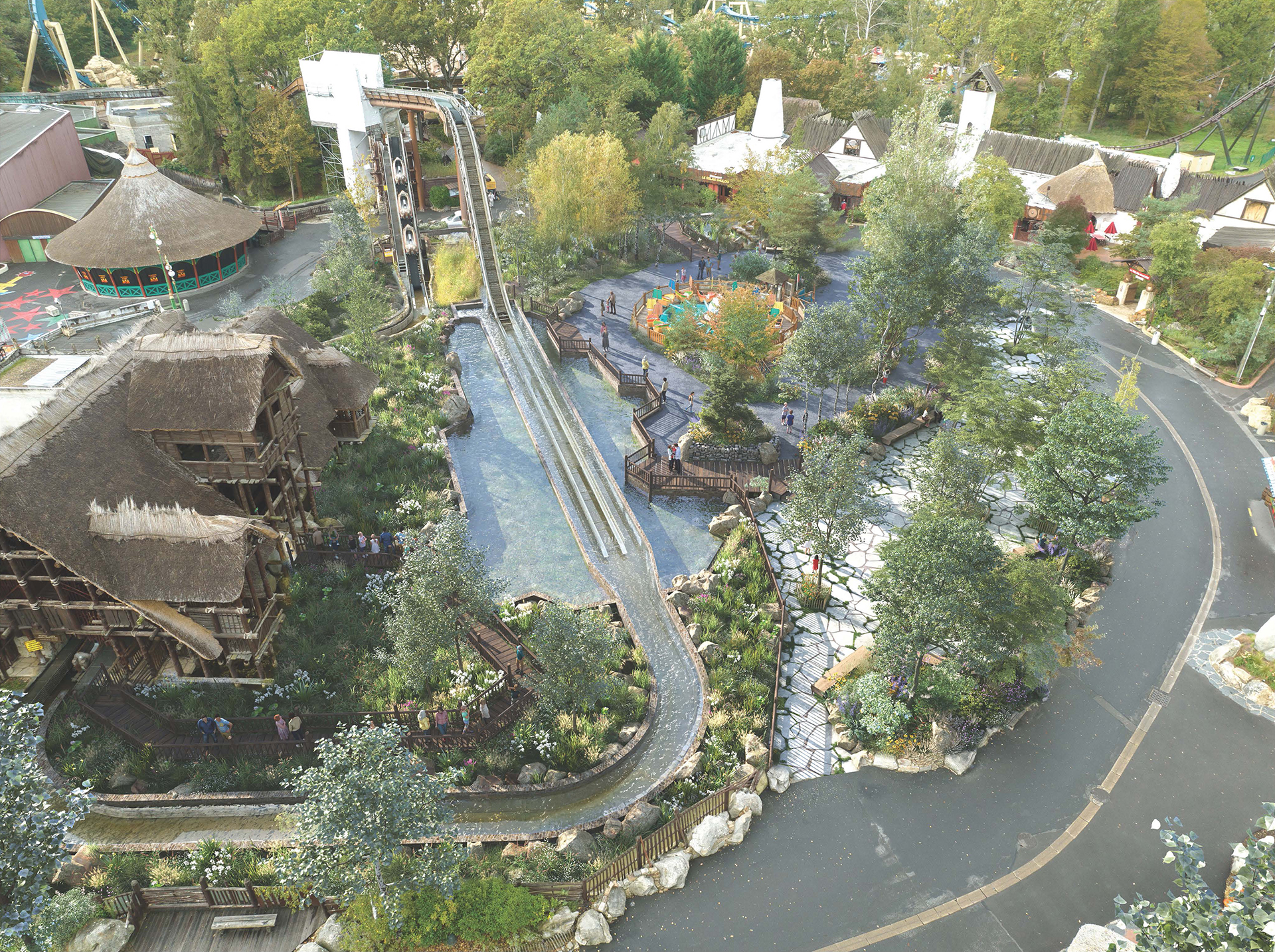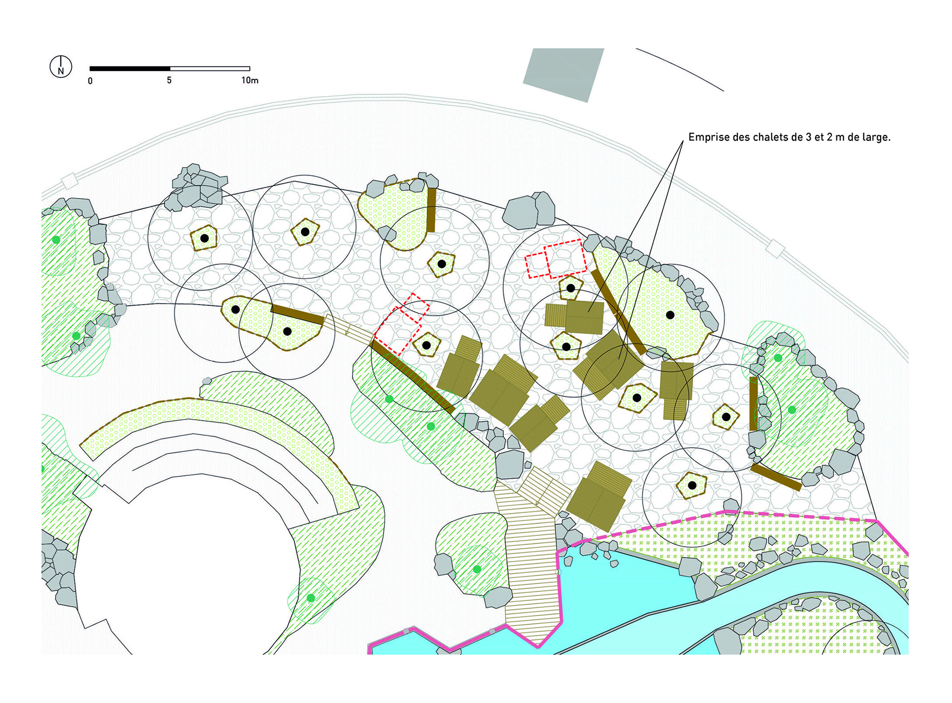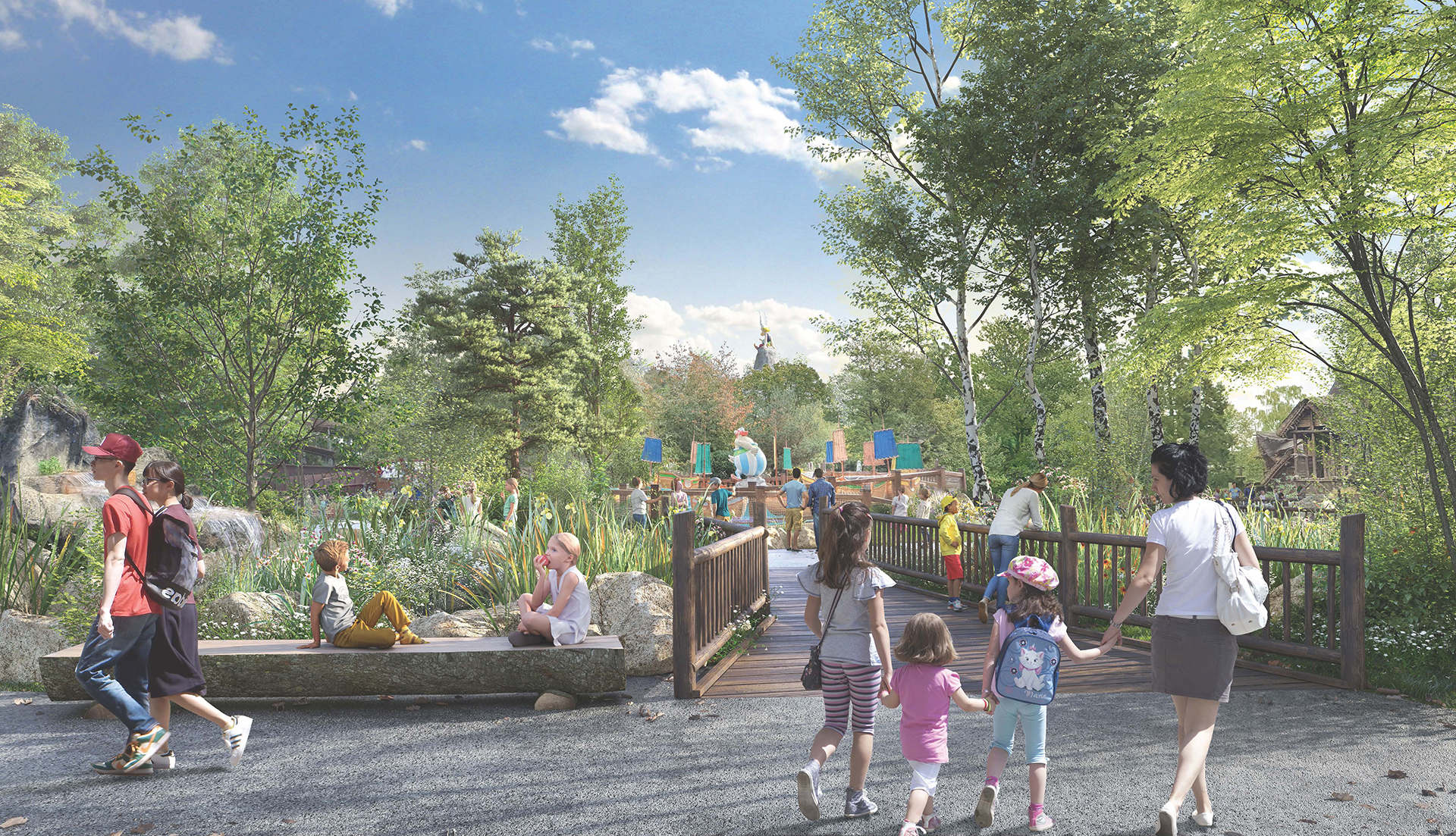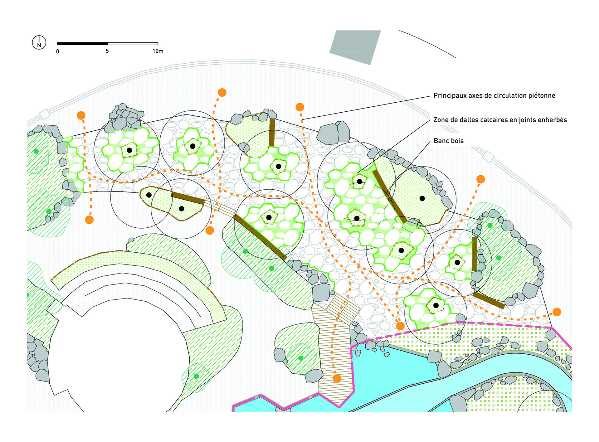 En collaboration étroite avec le parc, une étude est menée pour trouver des solutions d’aménagements capables de répondre aux différents enjeux scénographiques, environnementaux et fonctionnels. Différentes propositions émergent, tels que : la mise en valeur l’attraction, la lutte contre les îlots de chaleur, la mise en place d’un sol perméable, l’amélioration du confort des visiteurs, la création d’un espace modulable capable d’accueillir des manifestations diverses.