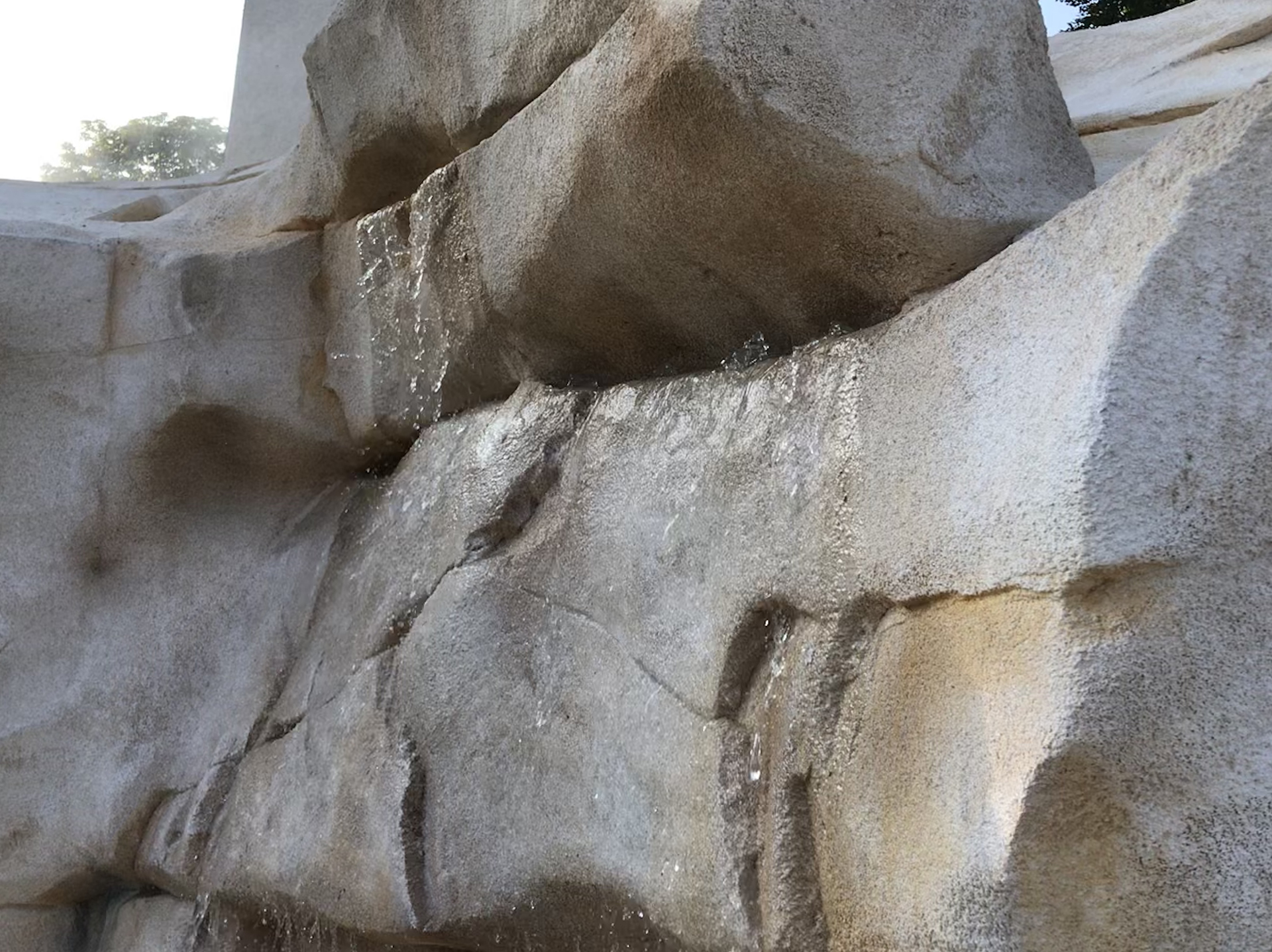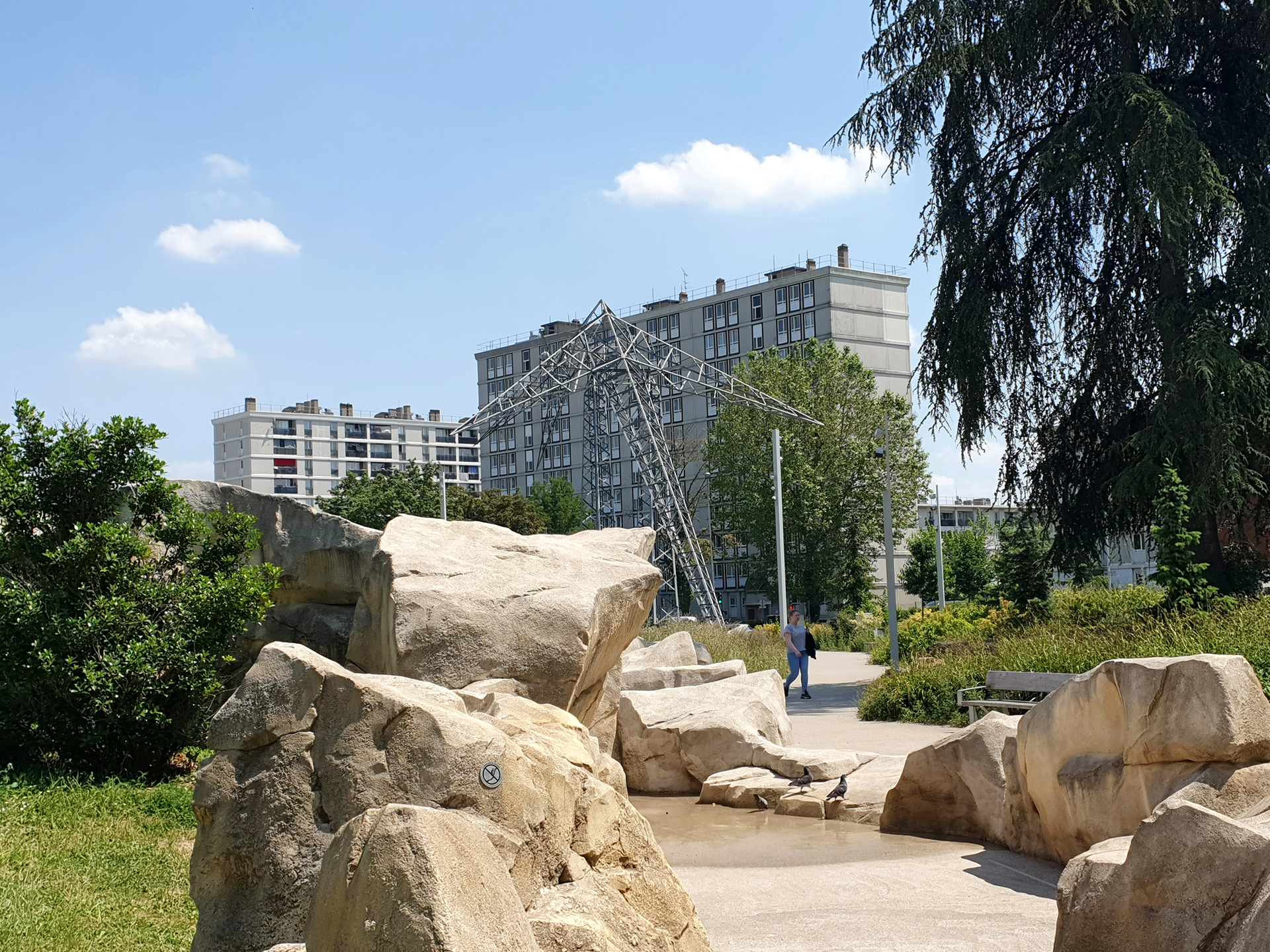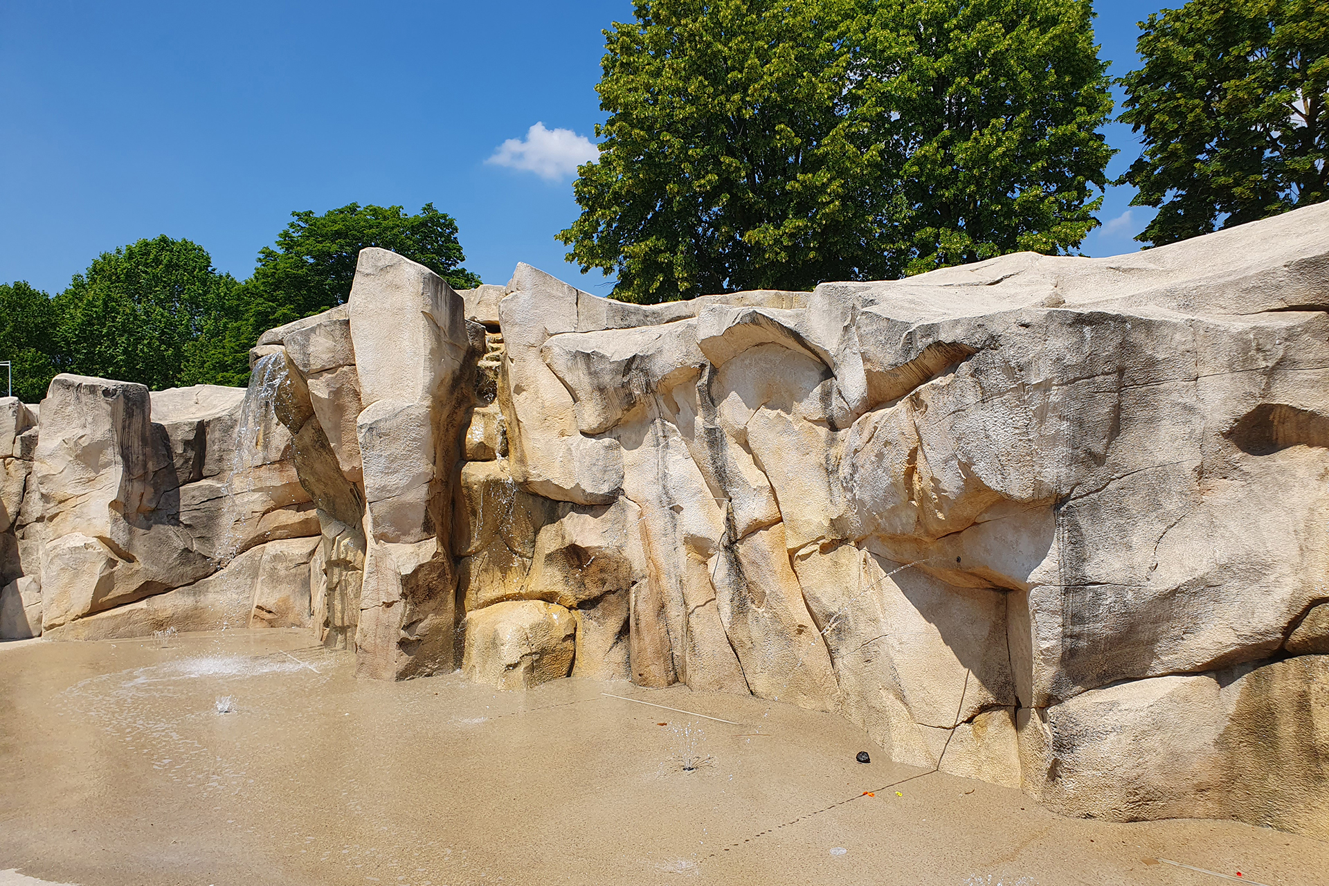 Elément structurant du parc de l’oiseau, la fontaine-canyon est un lieu attractif souvent envahie par les enfants. Longue de 35m et haute par endroit de 3m, la fontaine-canyon est réalisée en béton décoratif imitant une falaise. De ses aspérités, creux et failles, jailli de l’eau sous différentes formes.